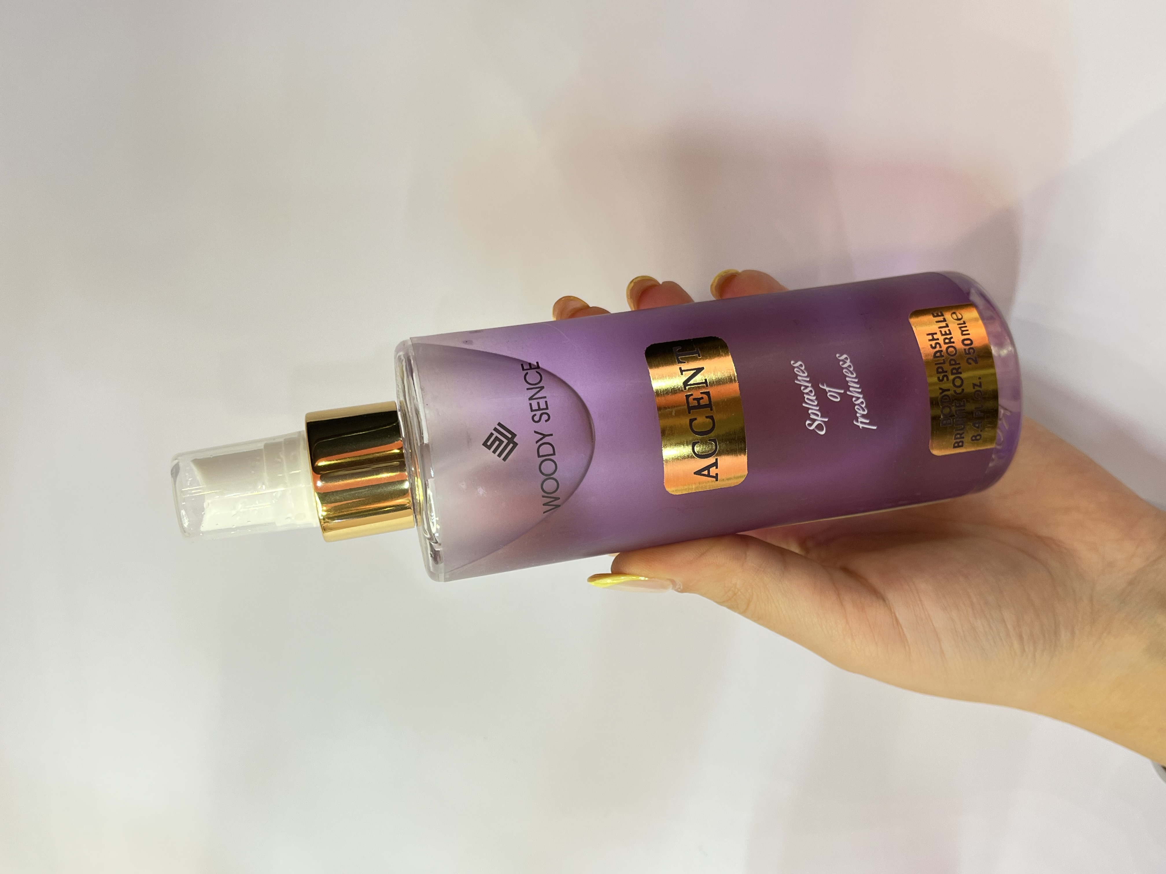 بادی اسپلش مردانه و زنانه اکسنت از برند وودی سنس مناسب انواع پوست مناسب استفاده روزانه دارای رایحه خنک دارای طبع چوبی، گلی و میوهای بدون هیچ گونه حس چسبندگی آبرسان و مرطوب کننده پوست جلوگیری از خشکی پوست جلوگیری از ایجاد بوی نامطبوع بدون ایجاد التهاب و حساسیت بدون ایجاد سردرد و آلرژی قابل استفاده برای لباس و بدن بدون ایجاد لک بر روی لباس خوشبو کننده بدن با ماندگاری بالا ایجاد حس طراوت و تازگی در طول روز