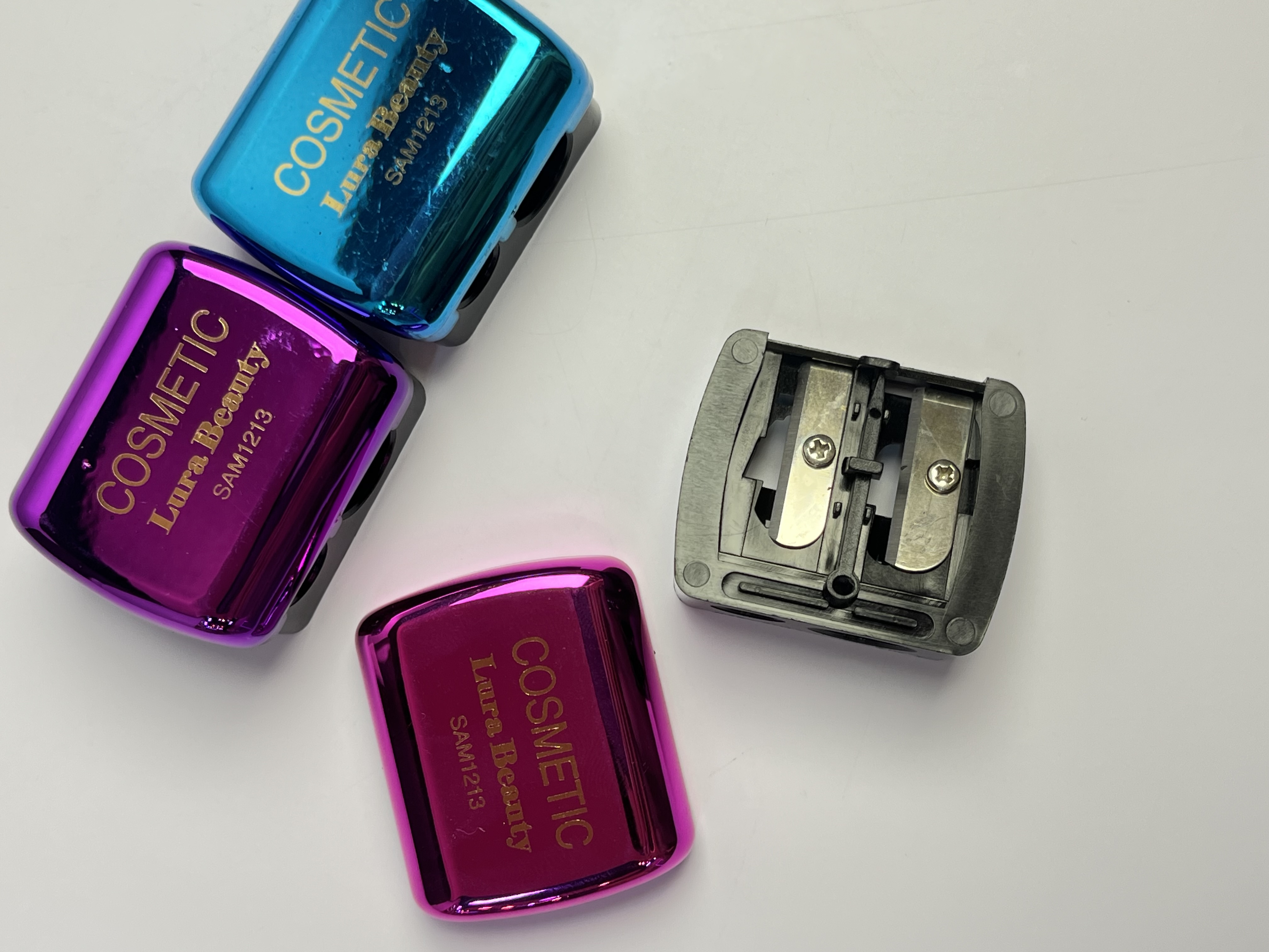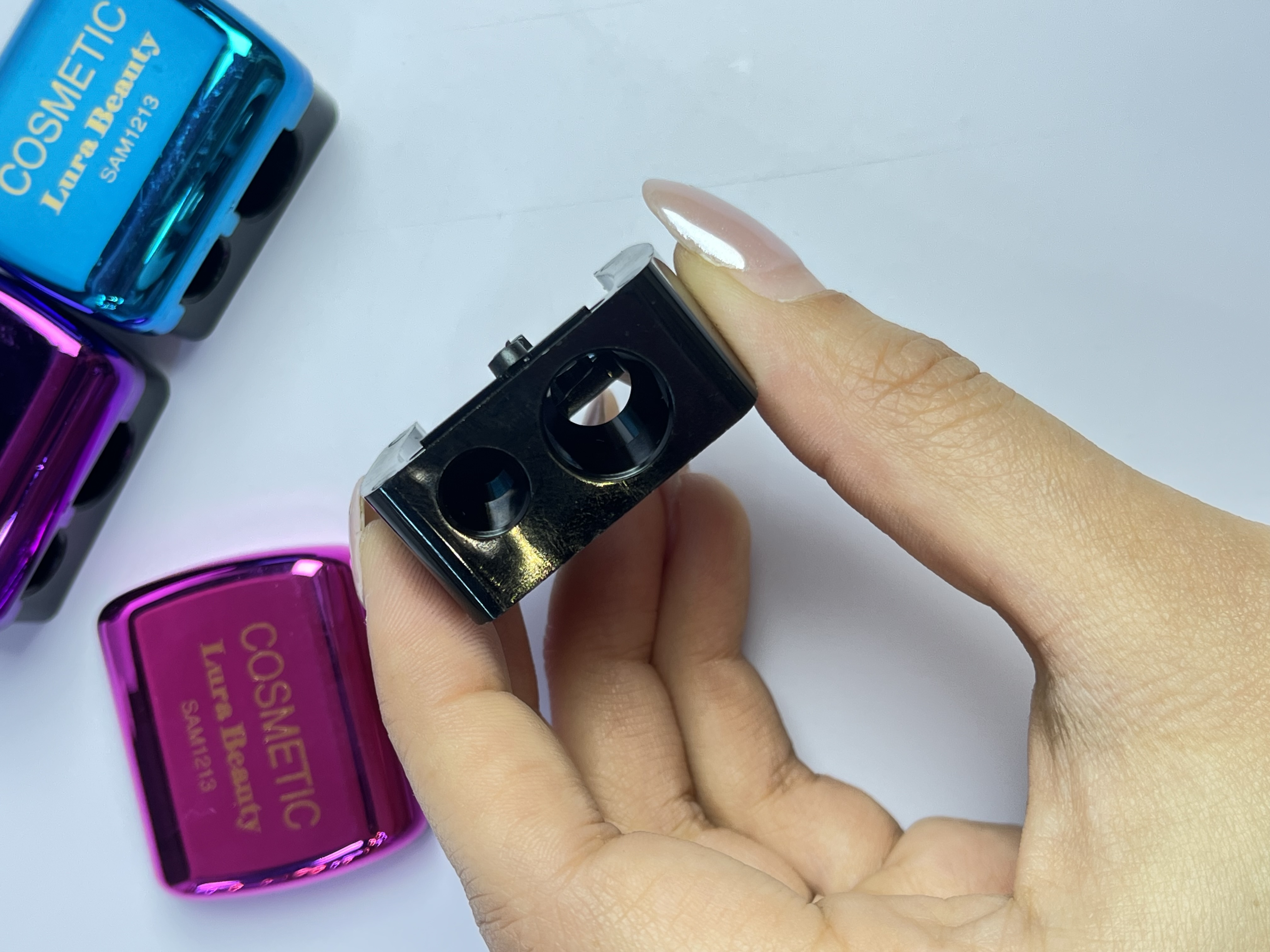 تراش دوتایی با درب محافظ دو روزنه کوچک و بزرگ جنس بدنه محکم و تیغههای تیز ابعاد 2.5 در 3.5 سانتیمتری مناسب تراشیدن مداد آرایشی بزرگ و کوچک